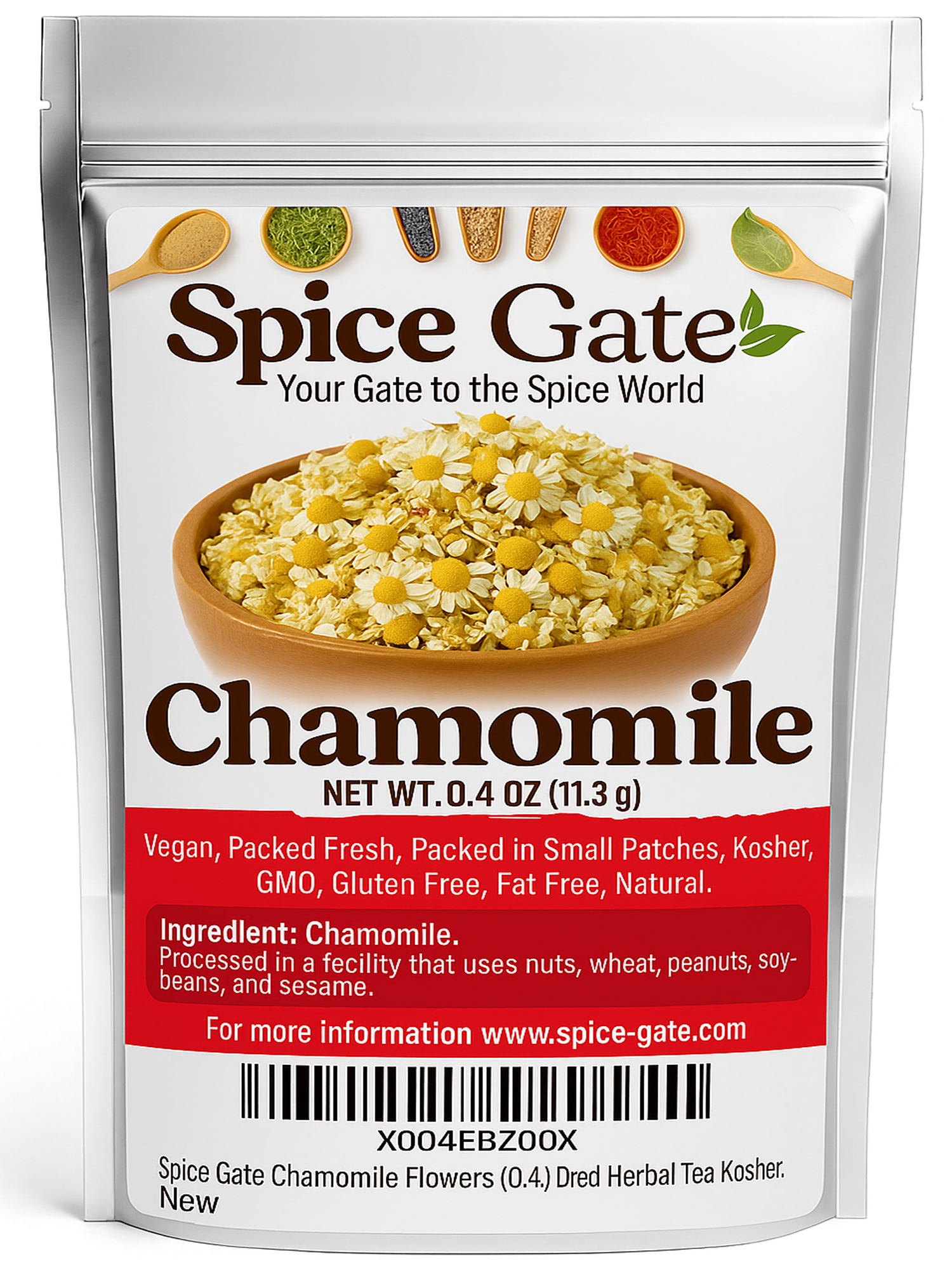 Spice Gate Premium Dried Chamomile Flowers – 0.4 oz | Whole Chamomile Blossoms in a Resealable Bag for Tea, Wellness & More Experience the calming benefits of Spice Gate Premium Chamomile Flowers, harvested from the finest sources and carefully dried to preserve their natural aroma and potency. Whether youre brewing a soothing cup of tea or incorporating it into your skincare routine, our chamomile blossoms offer versatile, all-natural wellness benefits in a convenient resealable bag. Key Features: - 100% Natural Chamomile Flowers – Pure, whole chamomile blossoms with no additives, preservatives, or artificial ingredients. Sourced for quality and freshness. - Soothing & Relaxing Tea – Brew a calming, caffeine-free tea that helps promote restful sleep, reduce stress, and support overall wellness. Perfect for unwinding after a long day. - Multi-Purpose Use – Ideal for herbal teas, infusions, skincare DIY projects, or even aromatherapy. Chamomile is known for its soothing properties, making it a popular ingredient in bath soaks, lotions, and more. - Aromatherapy Benefits – The gentle floral scent of chamomile flowers provides a natural way to calm your senses and create a relaxing atmosphere. - Sealable & Convenient Packaging – Comes in a 0.4 oz resealable bag to maintain freshness and extend the shelf life of the product. Easy to store and use whenever you need it. - Sustainably Sourced – Carefully selected from trusted suppliers, our chamomile flowers are grown and harvested using eco-friendly practices. Add Spice Gate Chamomile Flowers to your cart today and enjoy the natural goodness of this time-honored herbal remedy!